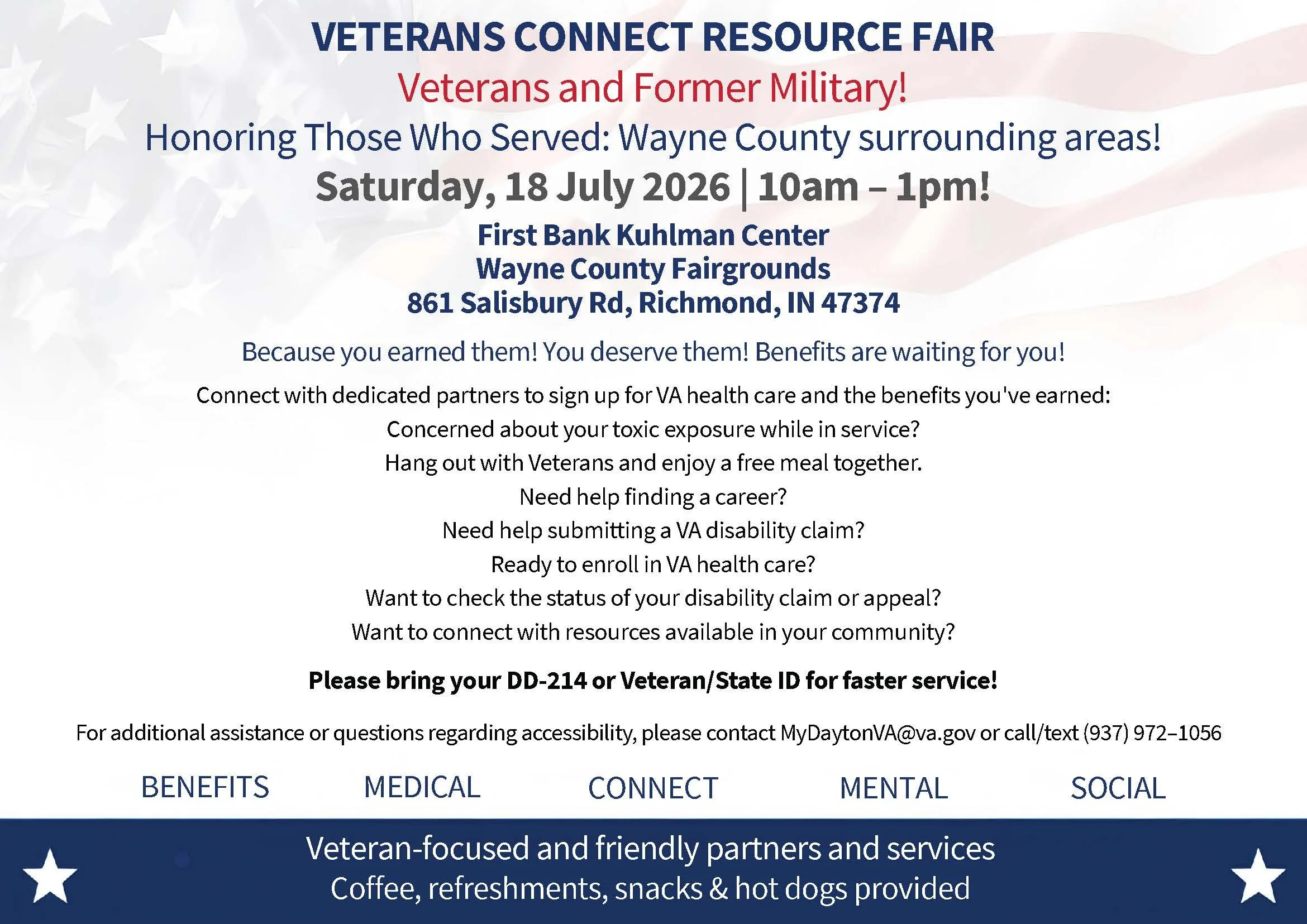VETERANS CONNECT RESOURCE FAIR 2026 Saturday, July 18, 2026 11:00 AM 12:00 PM First Bank Kuhlman Center 861 Salisbury Road Richmond, IN, 47374 United States (map) Google Calendar ICS LEARN MORE LEARN MORE