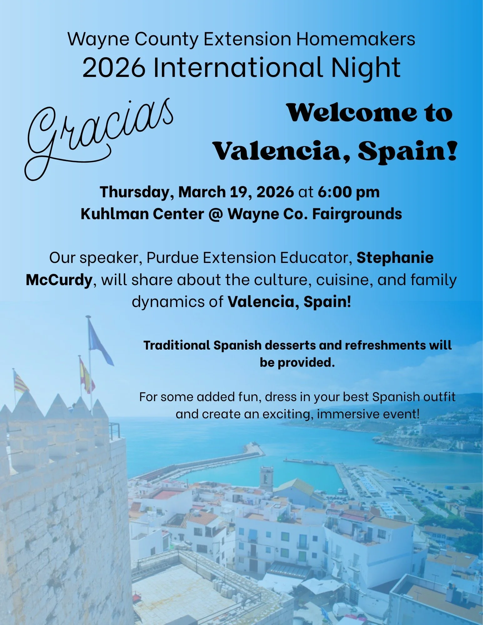 Our speaker, Purdue Extension Educator, Stephanie McCurdy, will share about the culture, cuisine, and family dynamics of Valencia, Spain!
